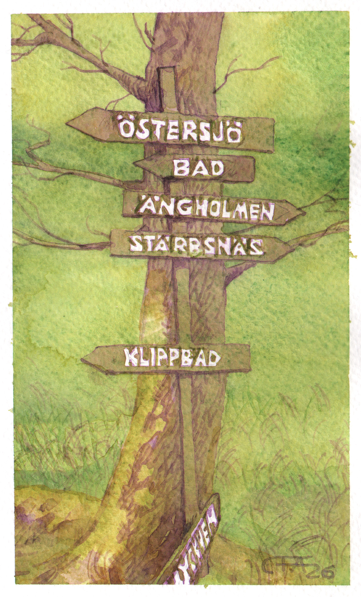 Vägvisare i skogen vid Lyckhem. Jag målade från minnet och minnet är inte perfekt. Skylten märkt "bad" ska naturligtvis peka åt andra hållet och eventuellt stavades Stärbsnäs med e.