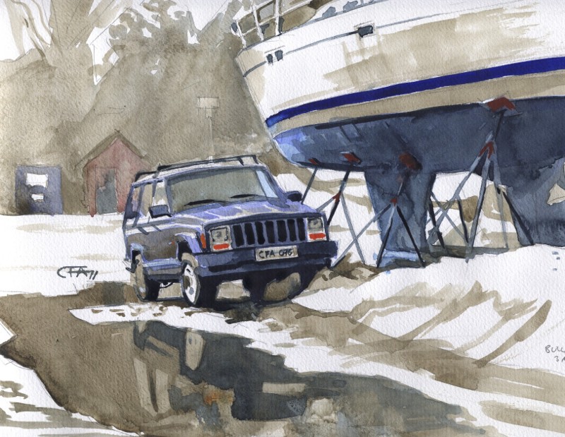En Jeep Cherokee och en uppallad Oceanis 473 på Bullandö Marina.