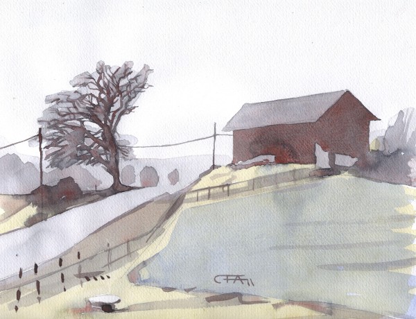 2011-04-03 Det var en fantastisk dimma idag (avlöstes av mindre fantastiskt regn). Egentligen hade jag tänkt måla i olja, men det var lite för kallt och blåsigt, så det fick bli akvarell ifrån passagerarsätet på bilen istället: