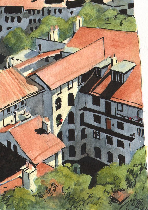 Utsikt från södra tornet på Cathédrale St-Pierre. De hade trafikljus i trapporna i kyrktornet så att det inte skulle bli trafikstockning. Mycket välordnat.