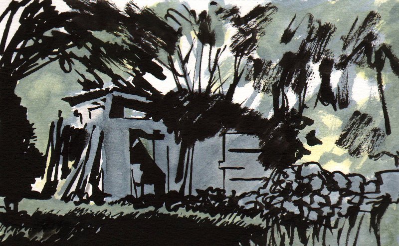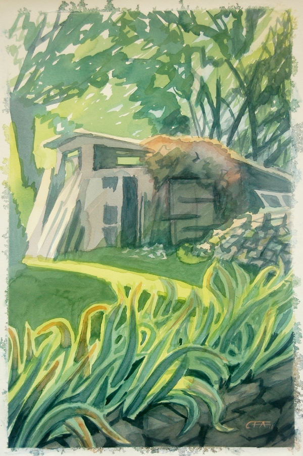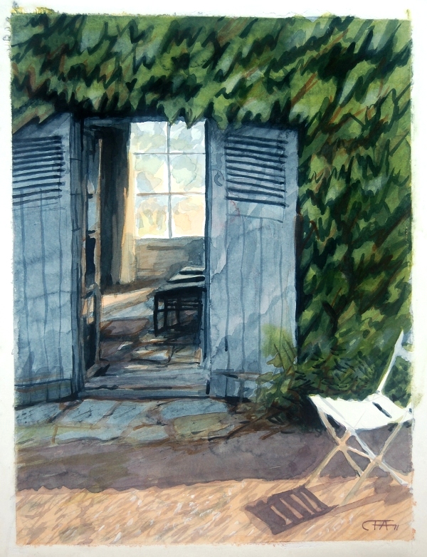 Huvudbyggnaden är ett stenhus med anor från 1600-talet. Jag målade bilden ovan som en grisaille med Payne's gray på satin-papper, som jag sedan färglade med varma färger.