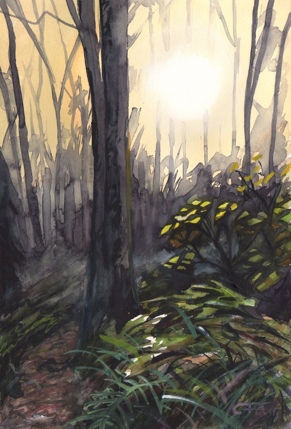 Var ute och promenerade i Nackareservatet i lördags. Jag försökte måla en akvarell, men färgen torkar alldeles för långsamt när det är så här kallt. Man kan visserligen blanda gin i färgen för att få den att torka snabbare, men jag hade ingen med mig. Resultatet blev misslyckat, men jag gjorde ett nytt försök hemma i ateljén. Lite överarbetat kanske, men hyfsat?