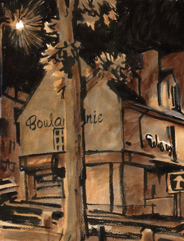 Bageri vid Place Courtonne med en platan i förgrunden, tusch och akvarell