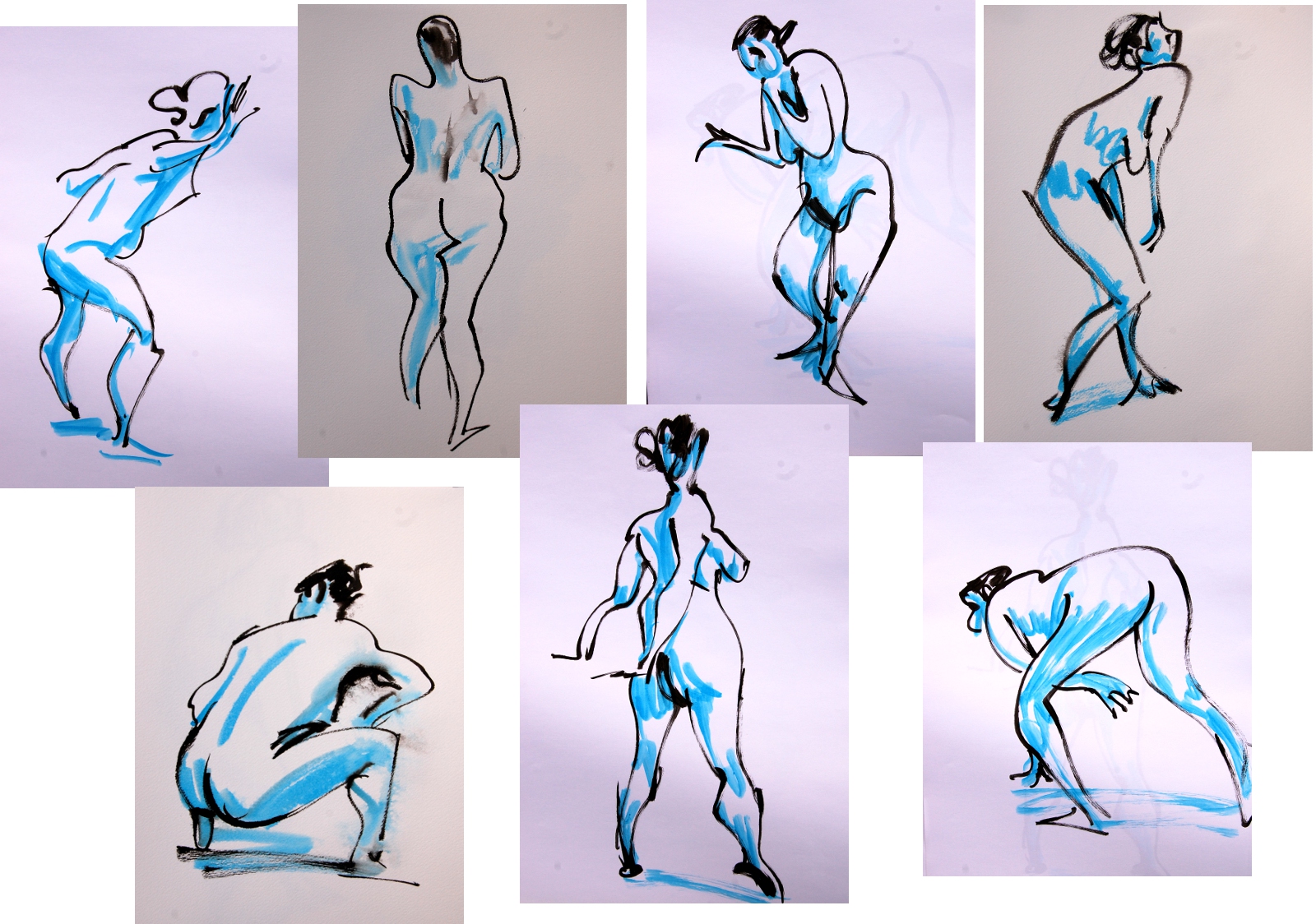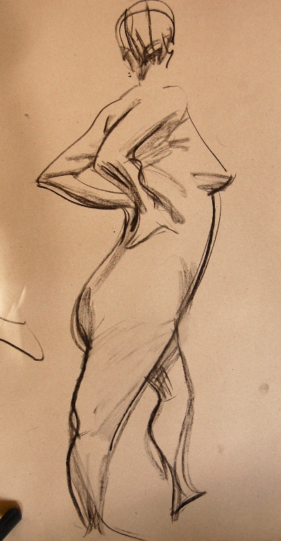 Workshopens andra dag så började vi med "concert de croquis", det vill säga vi tecknade av en modell som rörde sig till levande musik. Modellen fryser rörelsen i kortare ställningar så att man har en chans att hinna teckna. De flesta sitter på golvet och tecknar med kol på brunt papper.