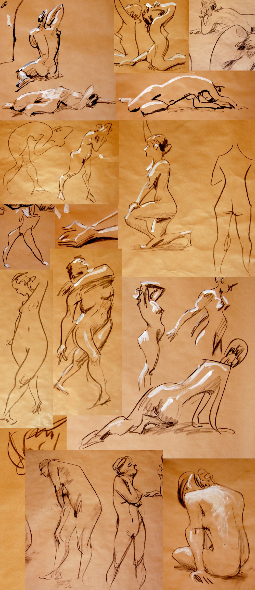 Eftermiddagen ägnade vi åt concert de croquis. Jag körde med kol och svart och vit tusch på brunt golvskyddspapper.
