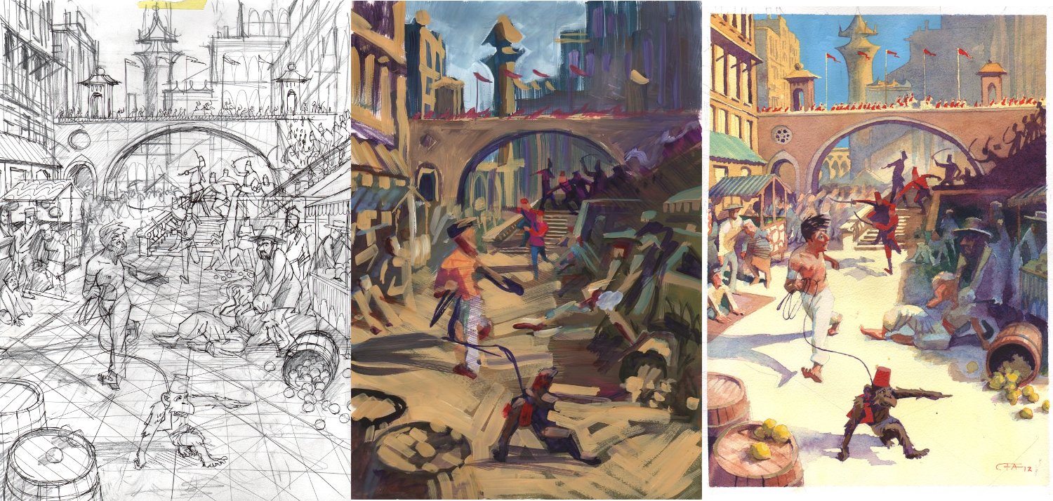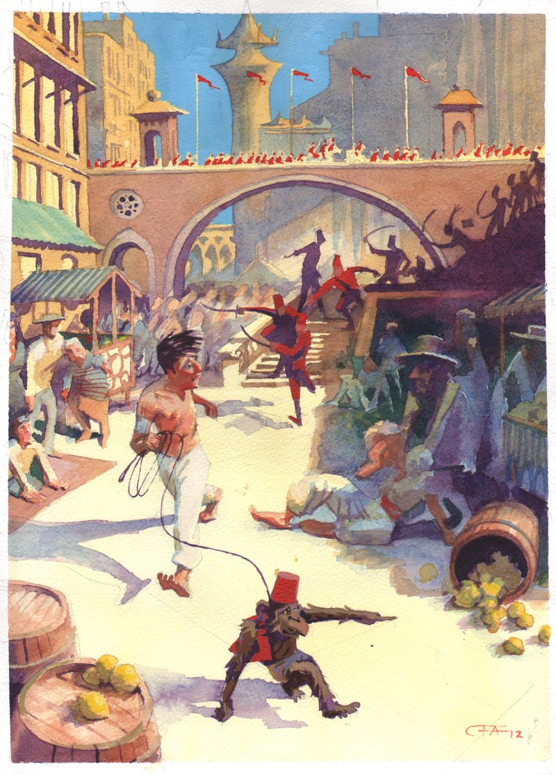 Den slutgiltiga målningen är i akvarell och gouache. Här var jag tvungen att offra mycket av de detaljer som jag lade ner så mycket jobb på i originalteckningen. Det bar emot förstås, men det gäller att inte dra bort uppmärksamheten från bildens fokus och man vill inte heller ha för mycket detaljer i skuggorna. Arbetet med detaljerna var ändå nödvändigt för att jag skulle förstå hur bilden hängde ihop rent logiskt (även om det finns en del logiska luckor).