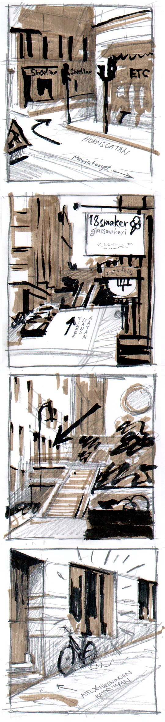 2012-07-11 Sedan en vecka tillbaka har jag en ateljéplats på Södermalm – en ateljéplats med skyltfönster! (Det har redan varit en del turister där och tagit bilder på mig när jag målar.) Platsen är i Ateljéföreningen Kattrumpan på Timmermansgatan 6. (På höjden ovanför Hornsgatan, nära Mariatorget.)