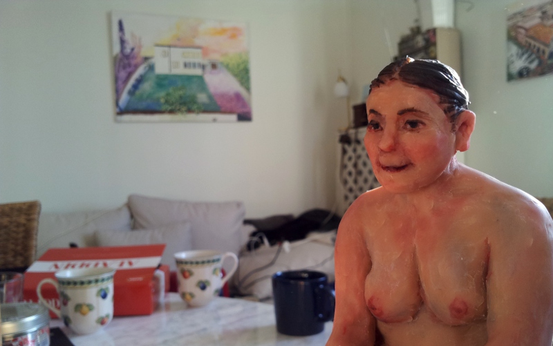 KB75 har satt igång igen med modellsessioner på söndagar och jag har just avslutat en skulptur av modellen Rosa. Den här gången arbetade jag inte med stengodslera utan med Super Sculpey. Sculpey-lera är inte lera egentligen utan en polymerbaserad massa som kan härdas i vanlig ugn vid 130 grader celsius. Det är ungefär samma sak som Cernit, men Super Sculpeyn är mycket mjukare att arbeta med. Den är svenne-hudfärgad och en liten aning transparent så den funkar bra att skulptera människor med.