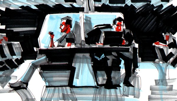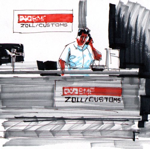 Bäst som jag som satt där och ritade så kom det en svensk dam åkande förbi på rullbandet med väskan släpandes efter sig. Hon talade högt med sitt resesällskap och målade upp en skräckvision vid åsynen av laptopbåsen. Hon såg en framtid där alla sitter i sin egen lilla värld och ingen umgås med någon annan. Kanske har hon rätt. Man kan inte kramas i cyberrymden.