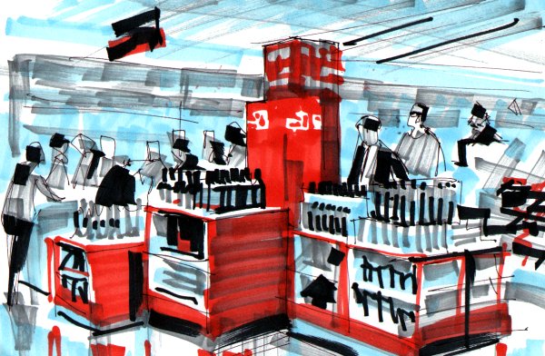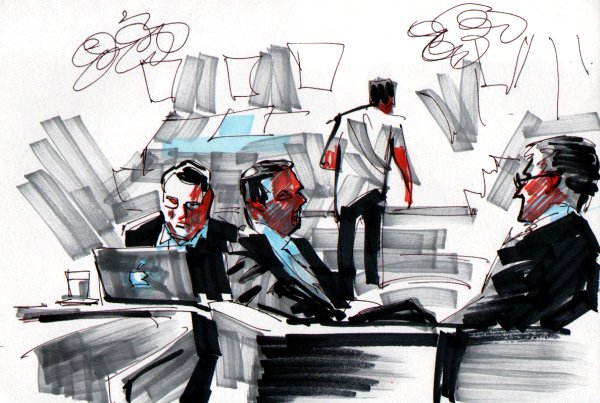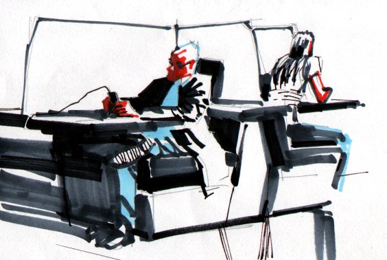 Det går inte så många direktflyg från Arlanda till Budapest, så flyget gick via Wien med Austrian Airlines. Kanske är det en kvarleva av det hapsburgska förtrycket? Nåväl, jag hade ett par timmar att fördriva på Wiens flygplats och där hittade jag ett slags laptopmöbler som bestod av fyra fåtöljer som satt ihop, avdelade med skärmväggar. På varje fåtölj satt ett litet bord som man kunde ställa datorn på och åtnjuta gratis Wifi, eller om man så ville, lägga skissblocket på bordet och rita av människorna i laptopkvartetten mitt emot. Där kunde man sitta i sitt eget lilla bås totalt ostörd (såvida nu inte fransmannen bredvid satt och skypeade utan headset och berättade om affärsresan för frun hemma i Nice).
