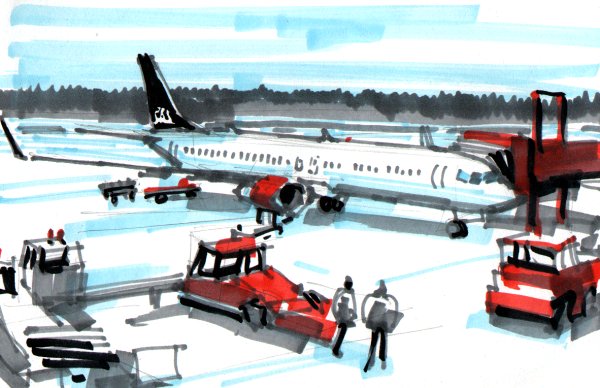 Men vad ska man titta på annars? Frågan är om man inte blir snabbare trött på det som finns inuti terminalbyggnaden. Reklam för GANT. Lekhörna med jättekantarell i glasfiber. I övrigt inte så mycket, förutom den kurviga kvinnan i cerise klänning som delade ut gratis räkmackor förstås. Erik Lallerstedt har rödlök på sina räkmackor sade hon.