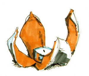 Innan vi gick ner i de underjordiska labyrinterna (fast sajten säger att de är stängda, så vi var väl nere i en falsk labyrint) som förutom det förutsägbara Dracula-temat av någon outgrundlig anledning hade skyltdockor uppställda för att spela upp Maskeradbalen av Verdi (den med mordet på Gustav III), så (och nu börjar meningen bli så lång att till och med en tysk filosof skulle nicka uppskattande) tog vi en coca-cola på ett närliggande café och hittade denna eleganta ljusstake gjord av apelsinskal.