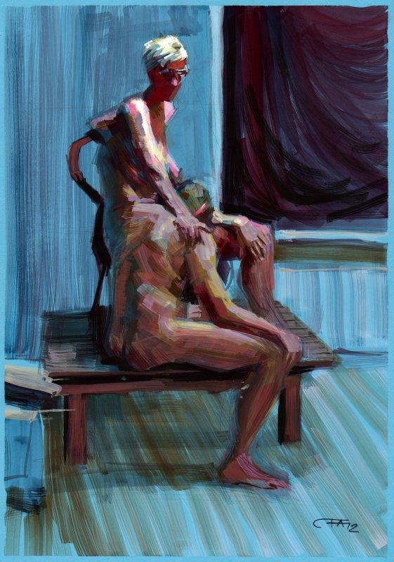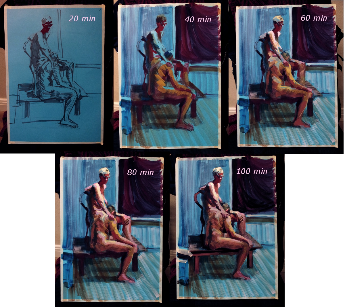 Atelier Stockholm hade som utlovat två modeller samtidigt i torsdags och jag var där. Modellerna höll samma pose under två timmar, fast i tjugo-minuterspass med raster mellan. Jag passade på att ta en bild av min målning varje rast så att vi kan se en målnings uppgång och fall: