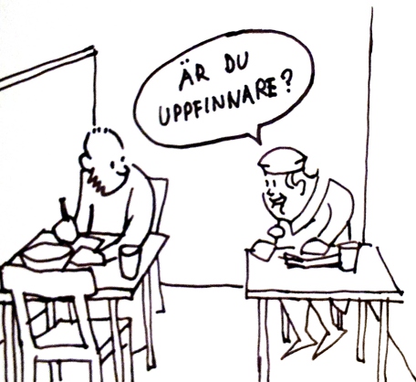 Jag hade just avslutat min lax-kimchi och satt och tecknade lite när hon vände sig till mig och frågade: - Är du uppfinnare? - Nej, sade jag, vilket är någorlunda sanningsenligt. Det var däremot hon. En gång när hennes man till exempel ville bygga ett betongfundament runt soptunnan för att inte grävlingarna skulle kunna välta den så föreslog hon att han istället bara skulle slå ner fyra stålrör i marken runt soptunnan. På så vis slapp de bära tunga cementsäckar.