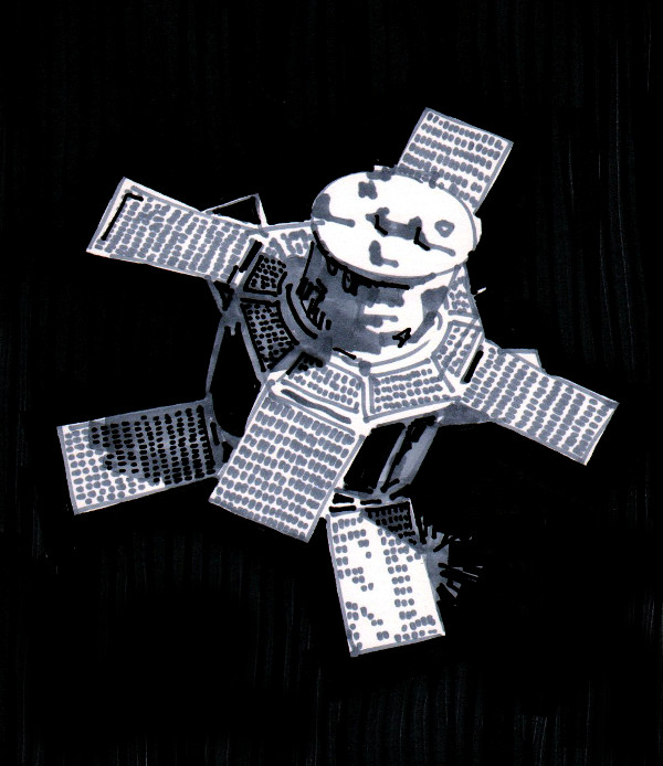 så stod det på satelliten som hängde i taken på Tekniska museet. Jag hoppades att det kunde vara en ledtråd till vad det kunde vara för satellit. Museet hade nämligen inte skrivit det på skylten. Däremot hade de varit hälpsamma och skrivit att det var en satellit och att satelliter finns i rymden. Det fanns visserligen pekskärmar överallt, men de kunde inte erbjuda någon utförligare information. Сою́з Сове́тских Социалисти́ческих visar sig tyvärr vara de tre första orden i Сою́з Сове́тских Социалисти́ческих Респу́блик, dvs. СССР, så det gav inte så mycket. Förutom det kunde jag bara se de romerska sifforna "IV" på undersidan av satelliten, om nu satelliter kan sägas ha en undersida.