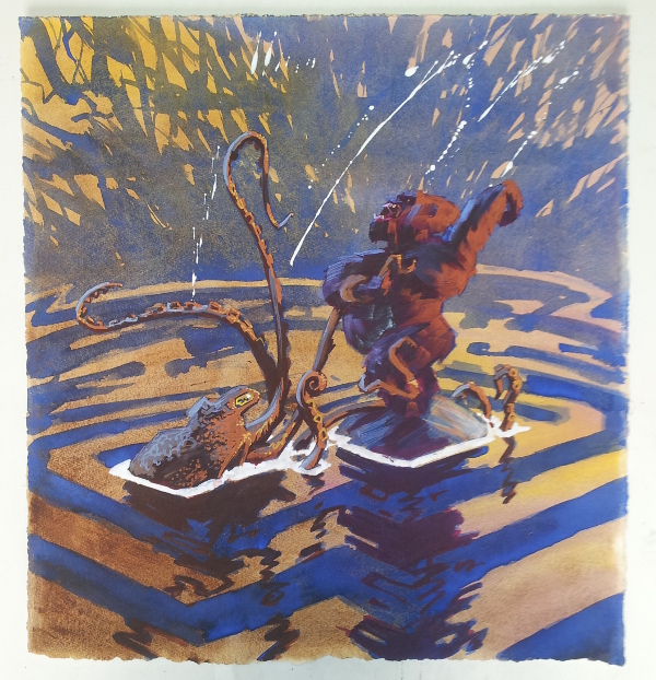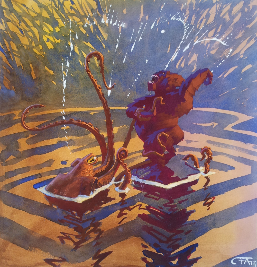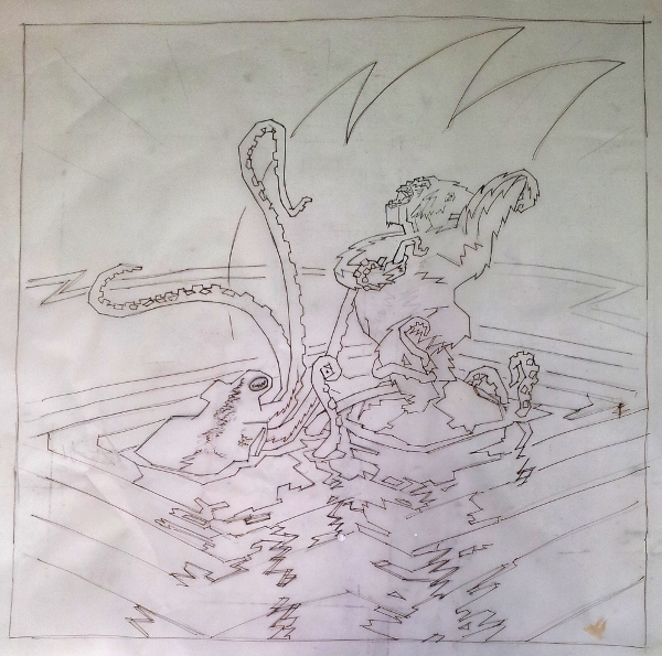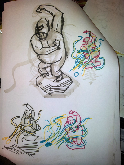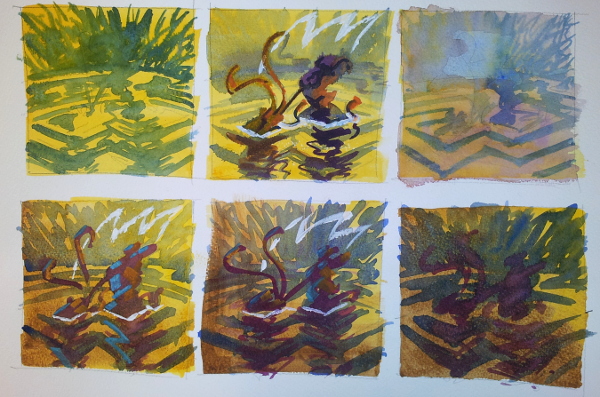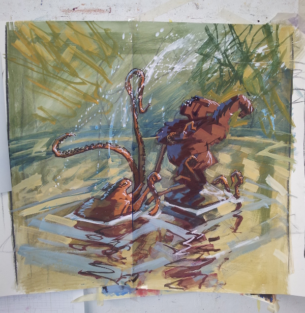 Några tidiga skisser. Det var svårt att komma fram till hur bläckfiskens armar skulle slingra sig.