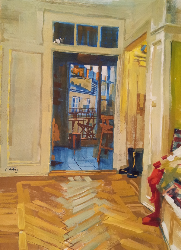 Jag vet inte riktigt varför det är så sällan jag målar interiörer. Kanske för att om man vill vara i fred och inte sitta i vägen för någon så är det enklare att vara utomhus. Inte vill man ju heller kladda färg på dyra möbler och golv. I alla fall är det synd. Jag har fått rådet att försöka få in flera rum i en målning. Jag har funnit att det är ett mycket bra råd. (Med "rum" avses här ett utrymme i mer abstrakt mening, inte nödvändigtvis ett rum i ett hus, även om det förstås funkar utmärkt.) Förutom att det ger en känsla av djup i bilden så ger det också en känsla av att världen som målningen representerar är större än det som syns. Man blir nyfiken på vad som finns runt hörnet.