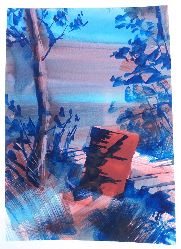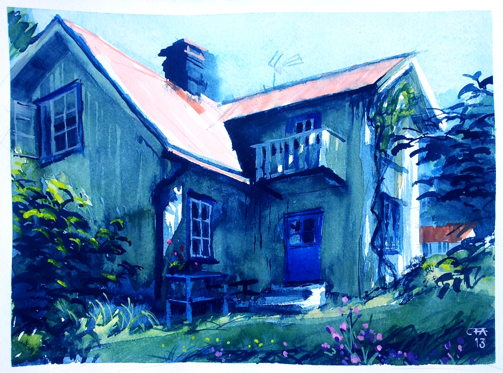 Idag kom det faktiskt regn och nu hör vi åskmuller på avstånd, men annars har det varit en varm och torr sommar här i Dalsland, där jag befinner mig nu. Akvarellen av stugan på Dammshöjden gjorde jag i skuggan av lönnen. Skuggan rörde sig förstås och jag fick flytta mig flera gånger för att inte bli stekt av solen.