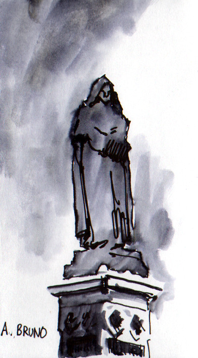 En staty av Giardano Bruno på Campo de' Fiori. Bruno brändes på bål 17 februari 1600 för att ha påstått att solen är en stjärna som alla andra. Vad A:et står för vet jag inte.