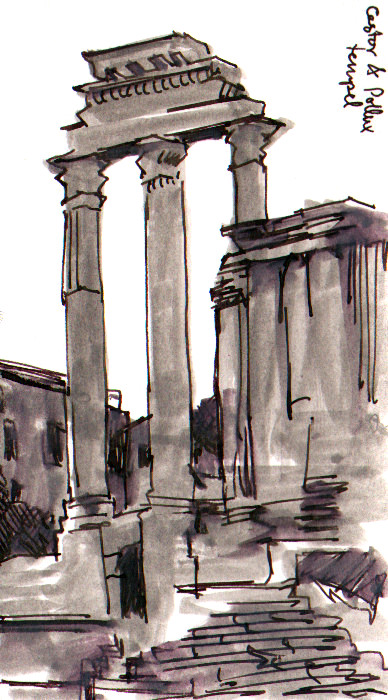 Tre kolonner är vad som återstår av Castor- och Polluxtemplet vid Forum Romanum.