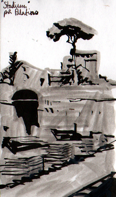 En teckning av "Stadium" på Palatinen. I själva verket troligen en trädgård i de kejserliga palatsen.