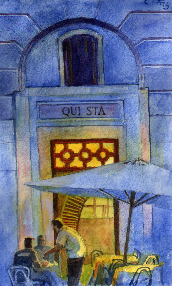 Målade Ristorante Da Pancrazio på flyget från Rom, utifrån skissen till höger. Det var ganska mycket turbulens, så det gällde att vara lätt på handen. En vattenpensel är en bra grej att ha när man flyger, så att man slipper ha en skål med vatten.
