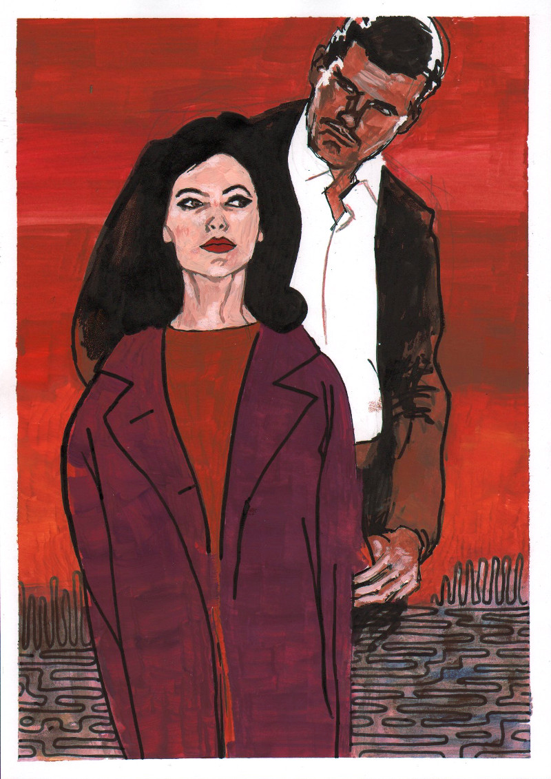 Det som fascinerade mig med originalet var hur illustratören lyckades göra en attraktiv bild av nästan enbart röda toner. Jag gillade också hur kvinnans hår flyter ihop med kavajen bakom. Man får bara ett par ledtrådar till hårets form, men ändå så räcker det för att förstå vad hon har för frisyr.