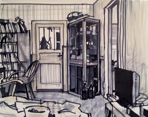 Den andra svårigheten är att man sitter så nära motivet. Om man ska teckna ett rum som man sitter i så är det svårt att ta in hela motivet på en gång. När jag ska avgöra proportionerna på olika föremål så kan jag inte göra det på känn, utan jag måste sitta och jämföra storleken på olika föremål med varandra och det är ganska tidsödande.