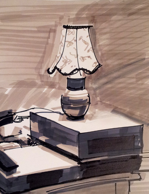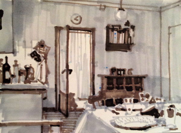 Jag tecknar sällan interiörbilder. Jag tror det är för att jag tycker att det är svårt. Dels brukar ljusförhållandena vara komplicerade, med flera ljuskällor. Kontrasten mellan ljus och skugga är stor, men övergångarna mellan ljus och skugga är mjuka. Solsken genom ett fönster är lättare att avbilda än ljus från en lampa inuti rummet.