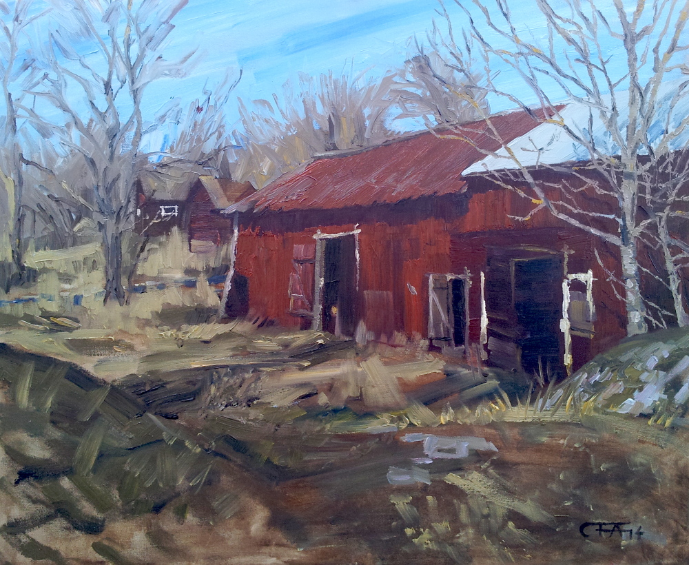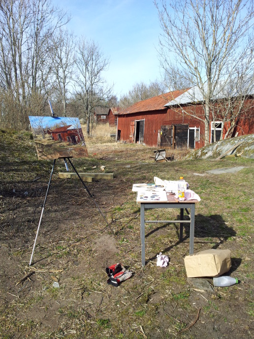 Var ute på lantstället i Roslagen i helgen och passade på att årets första oljemålning utomhus. Motivet blev vår lada igen. Jag gillar att måla lador. Måla av dem alltså. Det var ganska kyligt, så jag målade med arbetshandskar på.