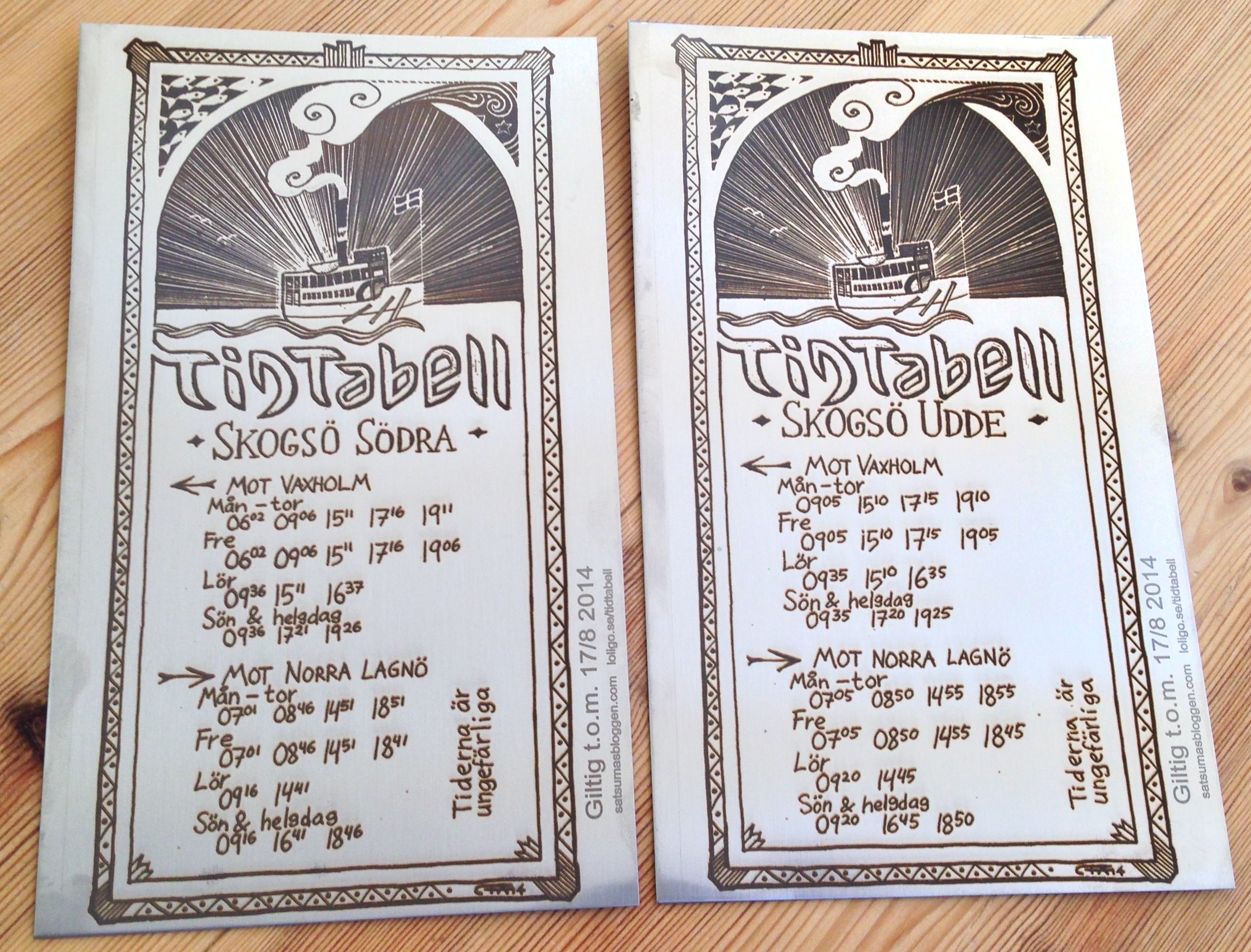 Min kompis Göran tyckte att det borde finnas tidtabeller i väntkuren när man sitter och väntar på skärgårdsbåten på Skogsön och han bestämde sig för att ta saken i egna händer. Han frågade mig om jag ville designa dem och det ville jag, så jag gjorde en bild med tusch på skrapkartong, sedan skannade jag den och så etsade Göran in bilden på metallplåt med sin laser. Resultatet bör vara tämligen väderbeständigt.