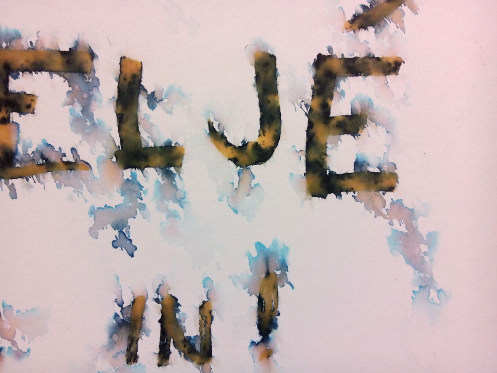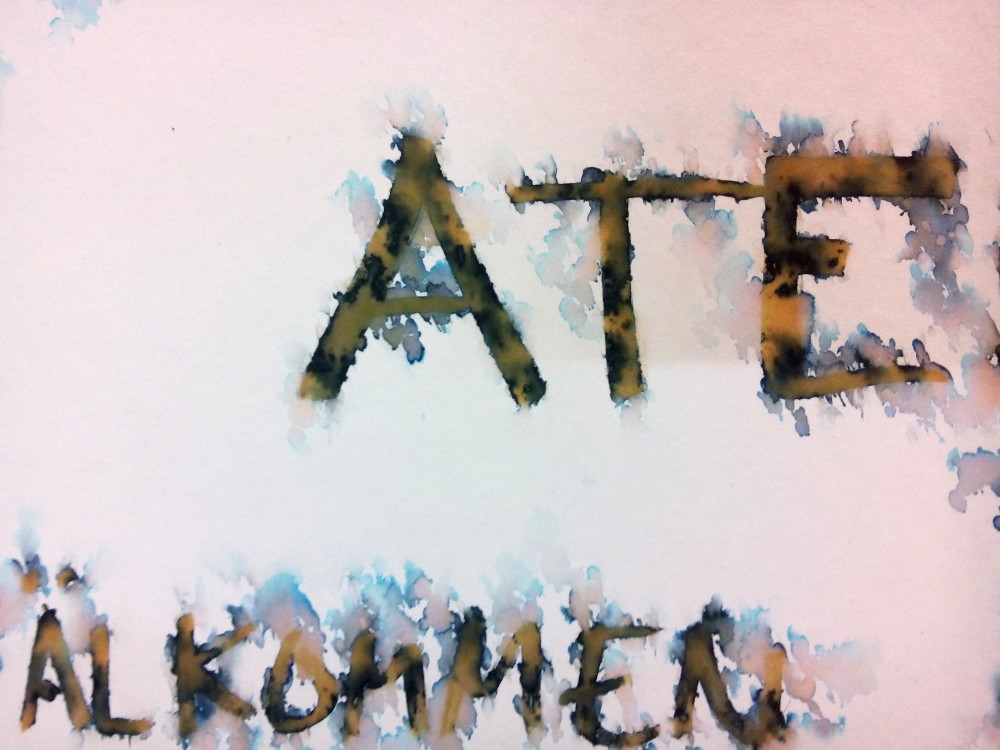 Det var roligt att så många tittade in när vi hade öppen ateljé första advent. När vi körde en repris i söndags (med något färre besökare) så regnade det på en av skyltarna som vi hade ställt ut. Resultatet blev ganska intressant. Jag hade skrivit texten med en billig filtpenna för barn (med doft) och den var uppenbarligen allt annat än vattenfast. Här ser man tydligt att det svarta bläcket egentligen består av flera olika pigment med olika färger. Det är vanligt i bläck som används i pennor. Äkta tusch görs på kimrök, det vill säga sot, men det är tjockt och torkar snabbt så det funkar inte så bra i filt- eller reservoarpennor.