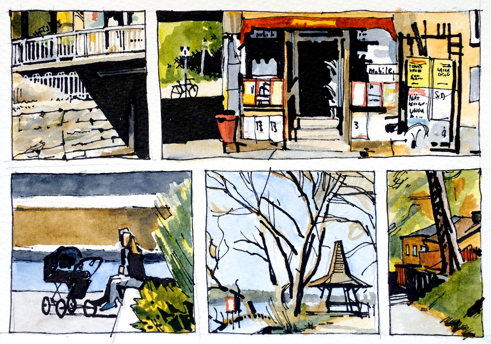 akvarell barnvagn bro cykel kiosk landskap plein air serie Stockholm träd Bild