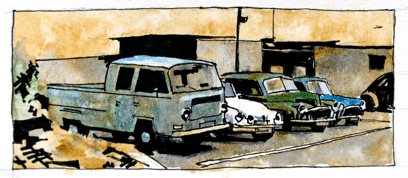 En VW pickup, en folkabubbla med sufflett, en Morris med delad framruta, och en Mini, utanför Klark Classic Cars.