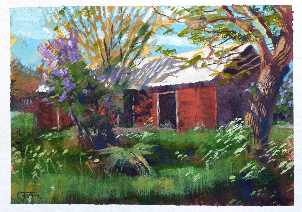 Björkö gouache lada landskap plein air Roslagen sommar syren träd