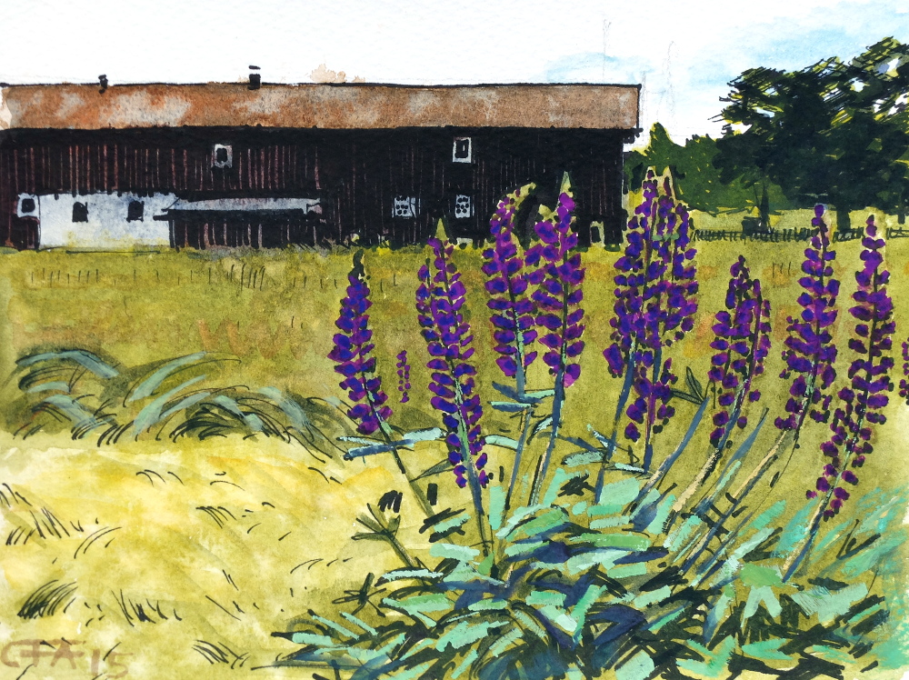 akvarell Björkö gouache lada landskap Roslagen sommar växter Bild