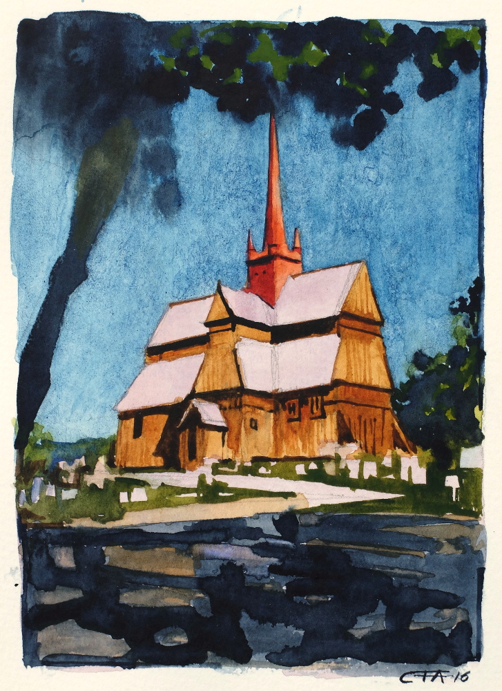 akvarell kyrka Norge