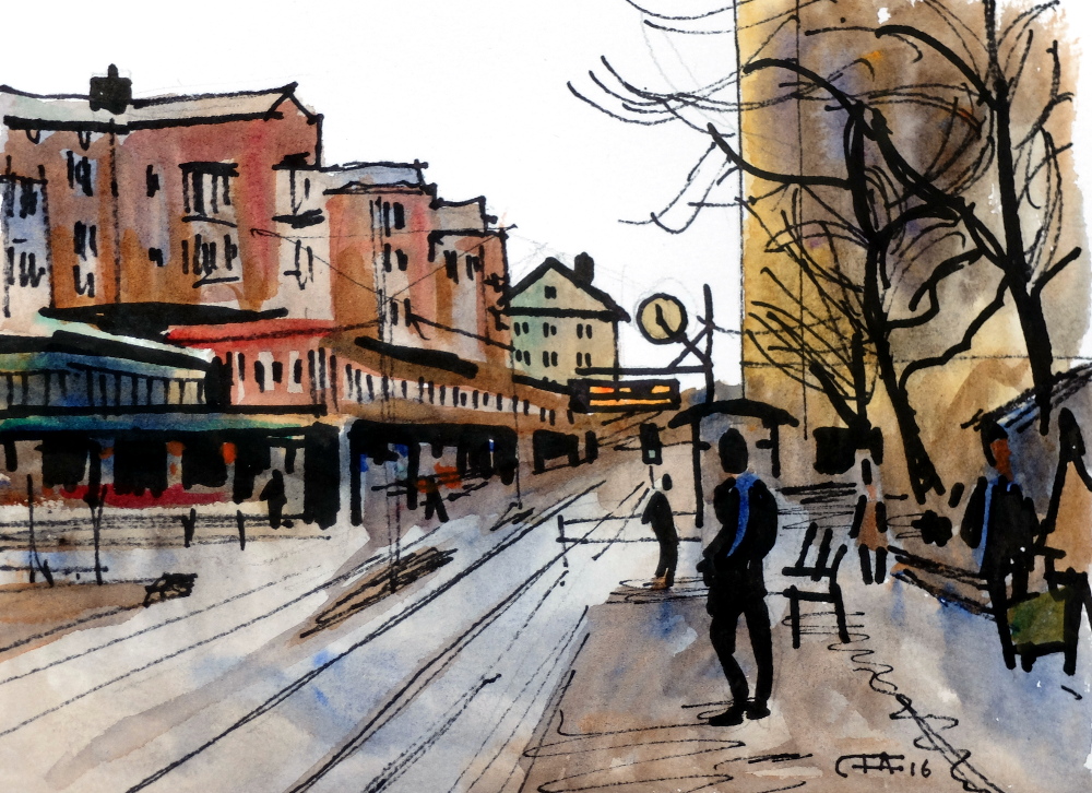 akvarell folk Gröndal plein air spårvagn Stockholm träd tvärbanan