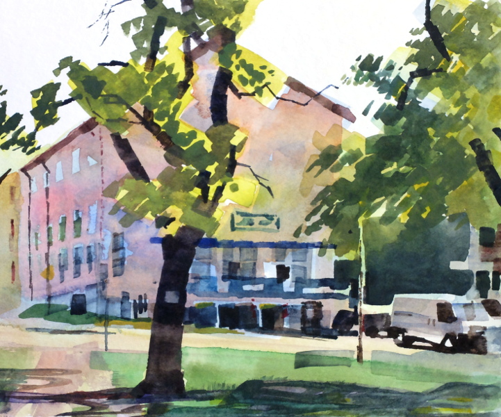 akvarell Aspudden Örnsberg bil plein air restaurang Stockholm träd verkstad