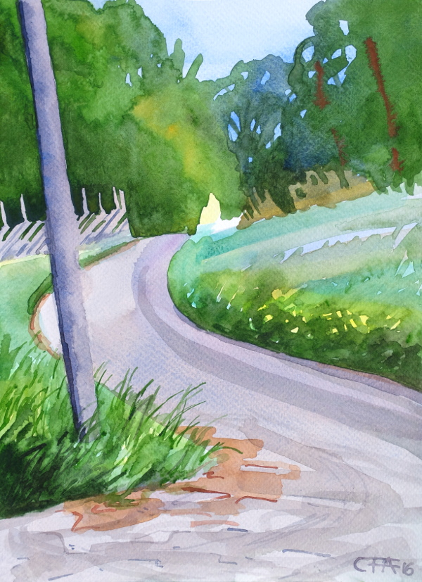 akvarell Björkö gärdsgård gräs landskap Roslagen sommar stolpe väg