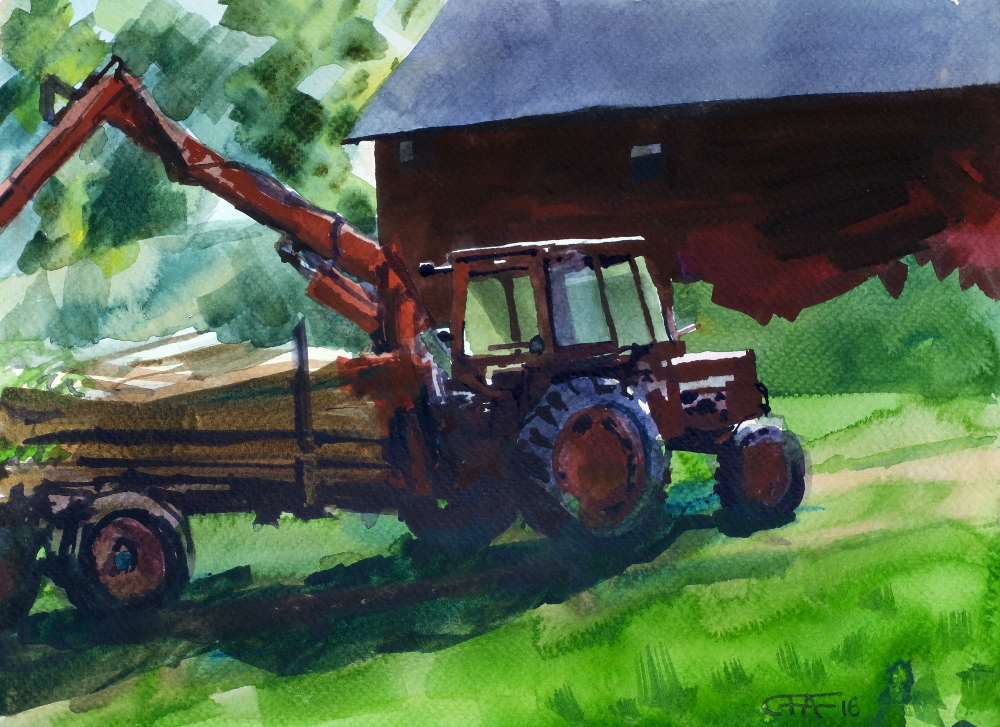 akvarell Dalsland lada maskiner plein air sommar traktor
