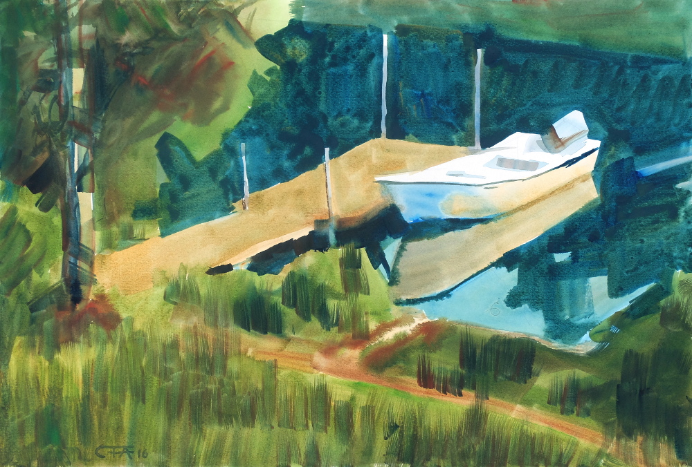 akvarell båt Björkö plein air Roslagen till sjöss träd vatten