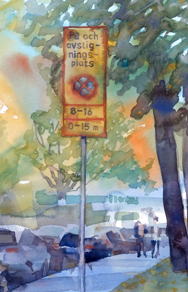 akvarell bil höst Midsommarkransen plein air skylt Stockholm träd