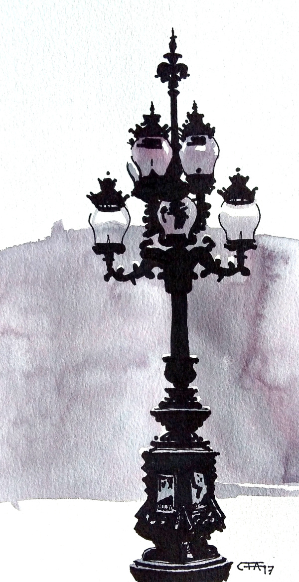 En av två gjutjärnskandelabrar vid Kungliga Operan. Formgivna av Gustaf Cederwall och ursprungligen avsedda för gasljus.