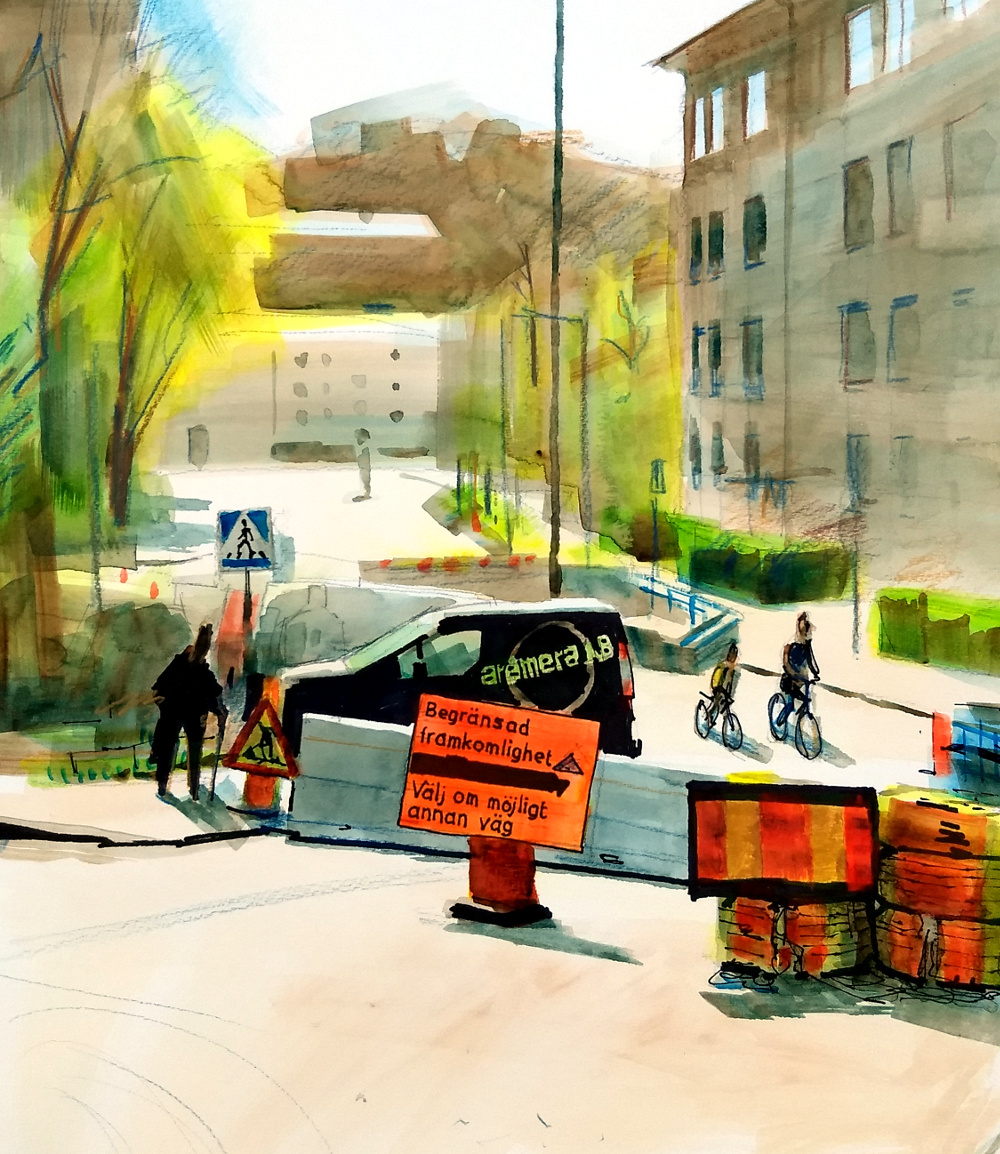 akvarell Aspudden Örnsberg bil cykel Hägersten markers plein air skylt Stockholm väg vägarbete vår