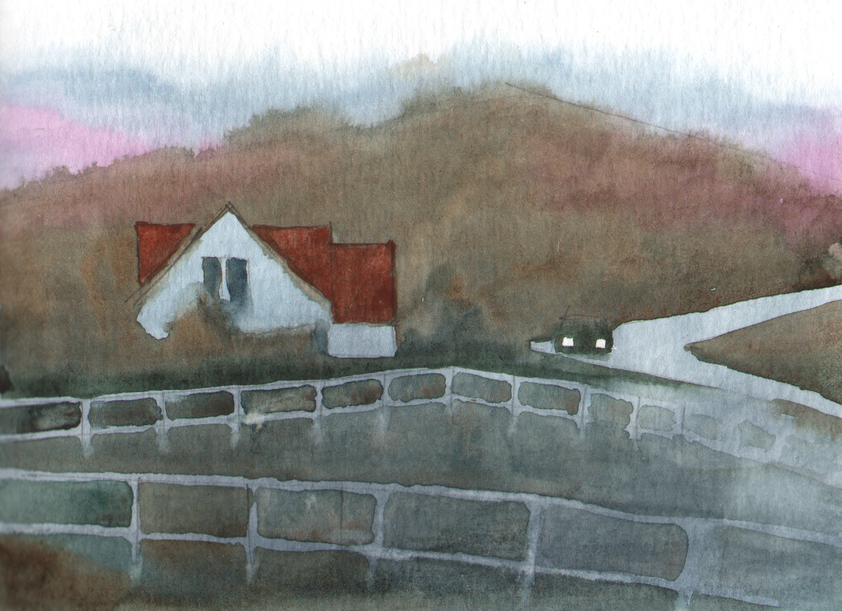 Smygehuk Skåne bil hus staket påsk akvarell nocturne