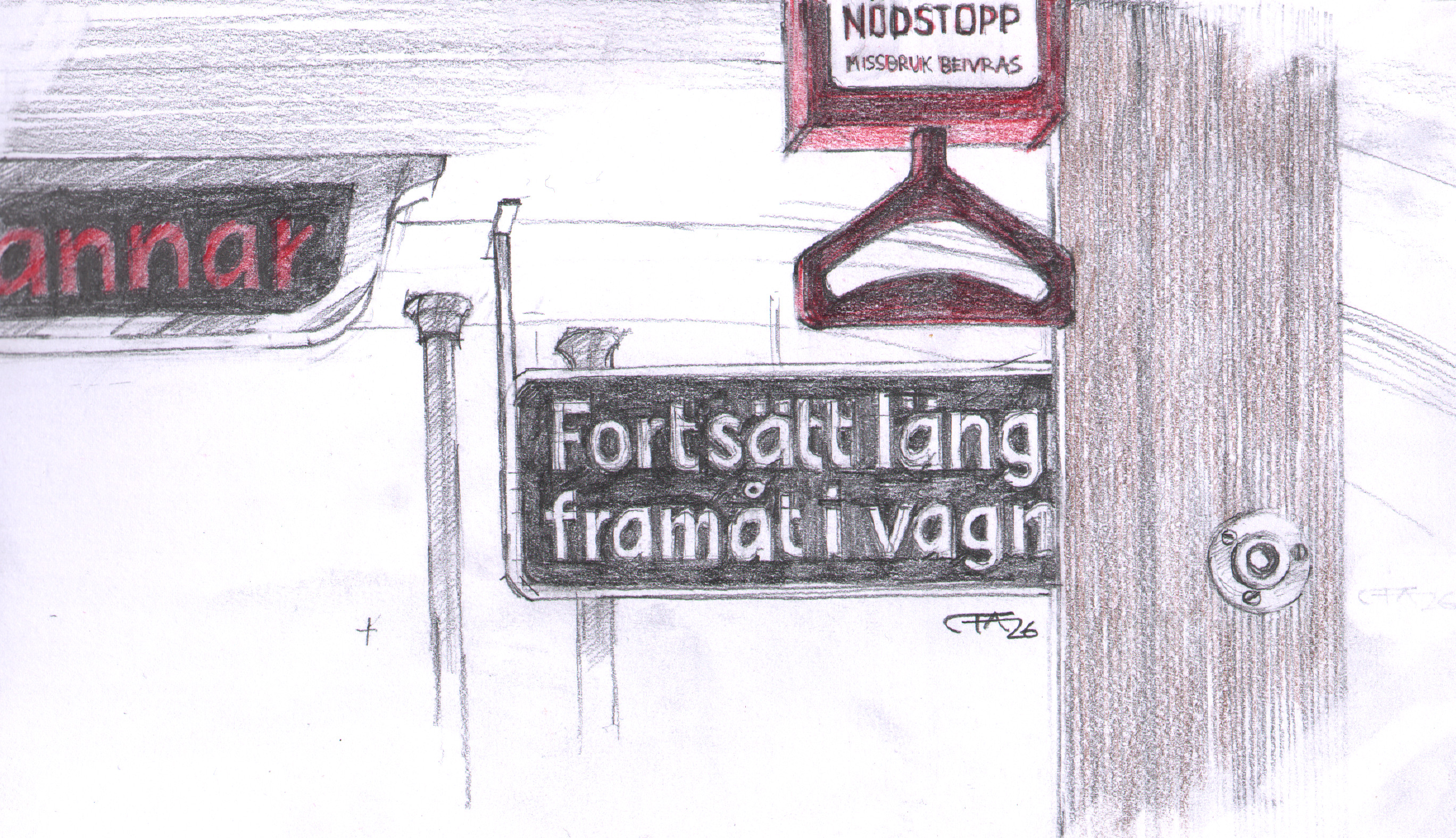 En teckning av interiören i en spårvagn, från minnet. Gammal spårvagn, men minnet är inte så gammalt. Den går fortfarande mellan Djurgården och Norrmalmstorg.